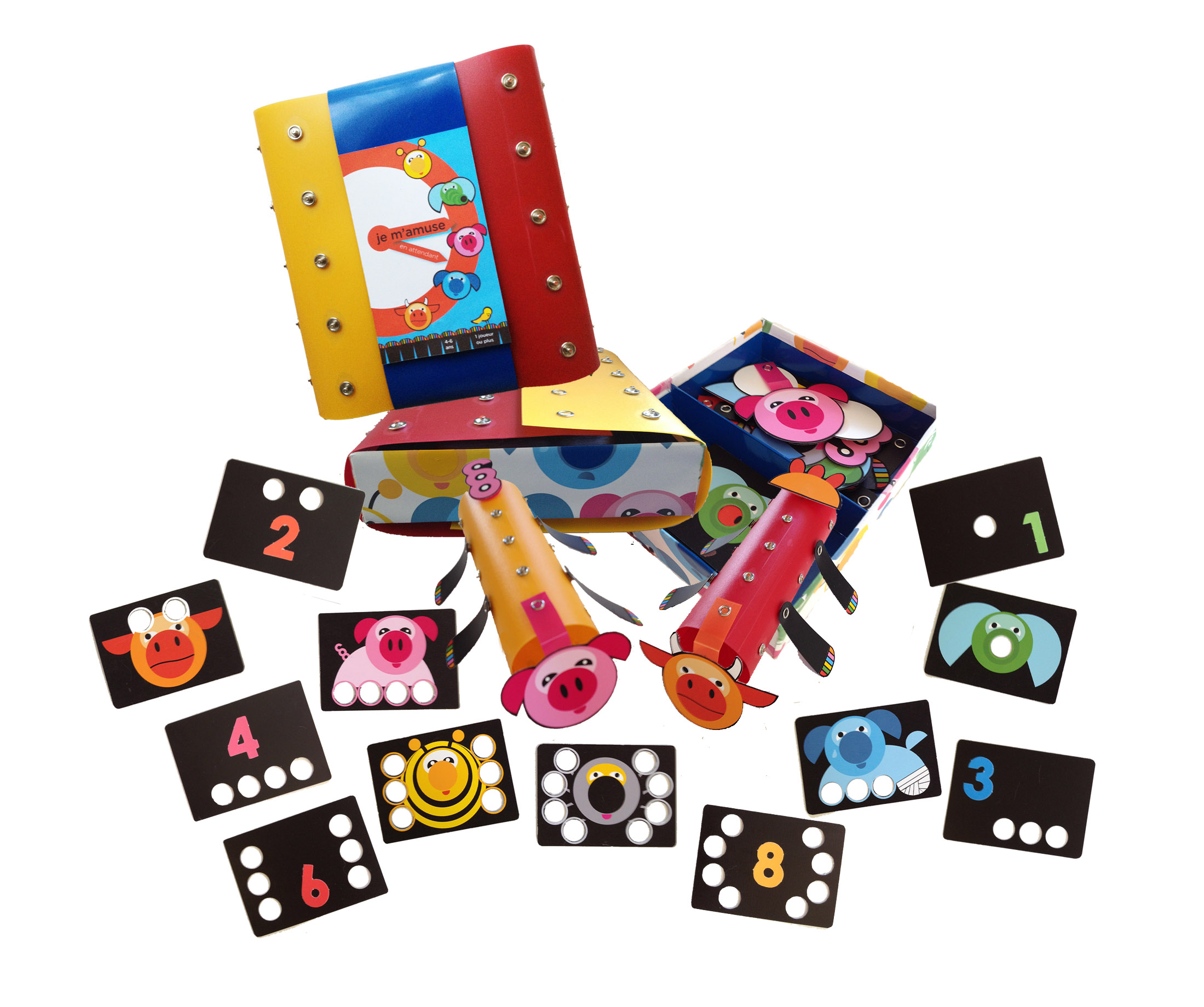 Dans la boîte, on retrouve également des marionnettes à doigts. Des cartes de plastiques dans lesquelles les enfants insèrent leurs doigts (dans les trous) pour créer un animal et inventer leurs propres histoires. Les enfants ont aussi adoré ces marionnettes. Mentionnons que la carte-éléphant était la plus populaire ! Les chiffres à l’endos de la carte peuvent initier aux mathématiques.