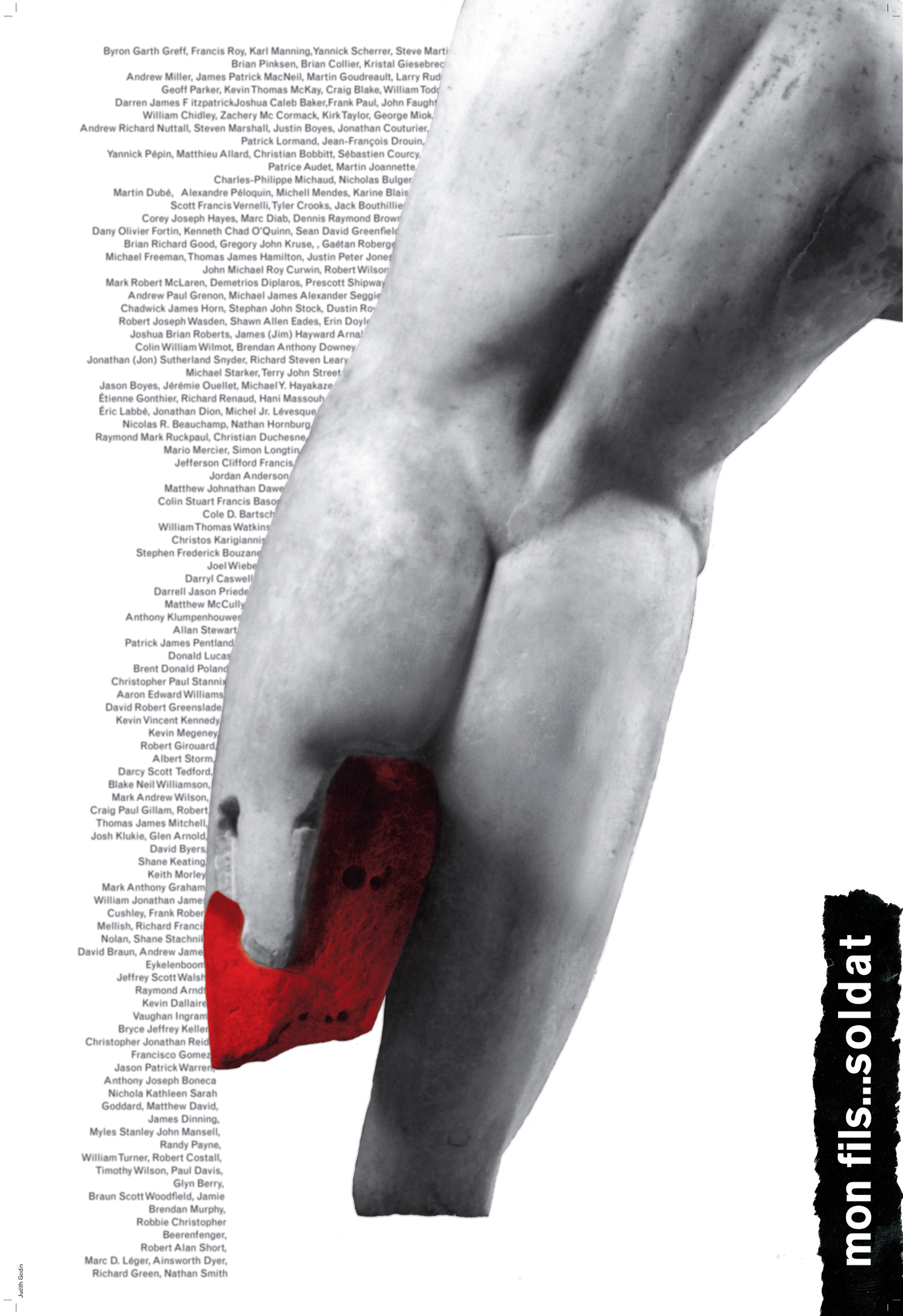 Dans le cadre du cours Design-International en mai 2013, j’ai produit cette affiche qui avait pour thème : mon fils…soldat.Le torse d’un discobole grec fut ma source d’inspiration à la base. Cette statue qui a traversé le temps depuis le 3e siècle avant J.C. a subi un traumatisme sérieux : plus de bras, plus de jambes, plus de tête. Ce qu’on peut constater régulièrement dans les musées. Malheureusement, ce qui peut arriver également à un soldat qui part à la guerre…Je trouvais le paralèlle intéressant car non seulement il est privé de ses membres mais de plus, il s’agit d’un athlète (discobole). Je ne peux m’empêcher encore une fois d’établir un lien entre ce corps qui suppose une grande forme physique et celui d’un soldat qui est au maximum de sa capacité…pour affronter la mort et finir comme cette statue. Absurdité.