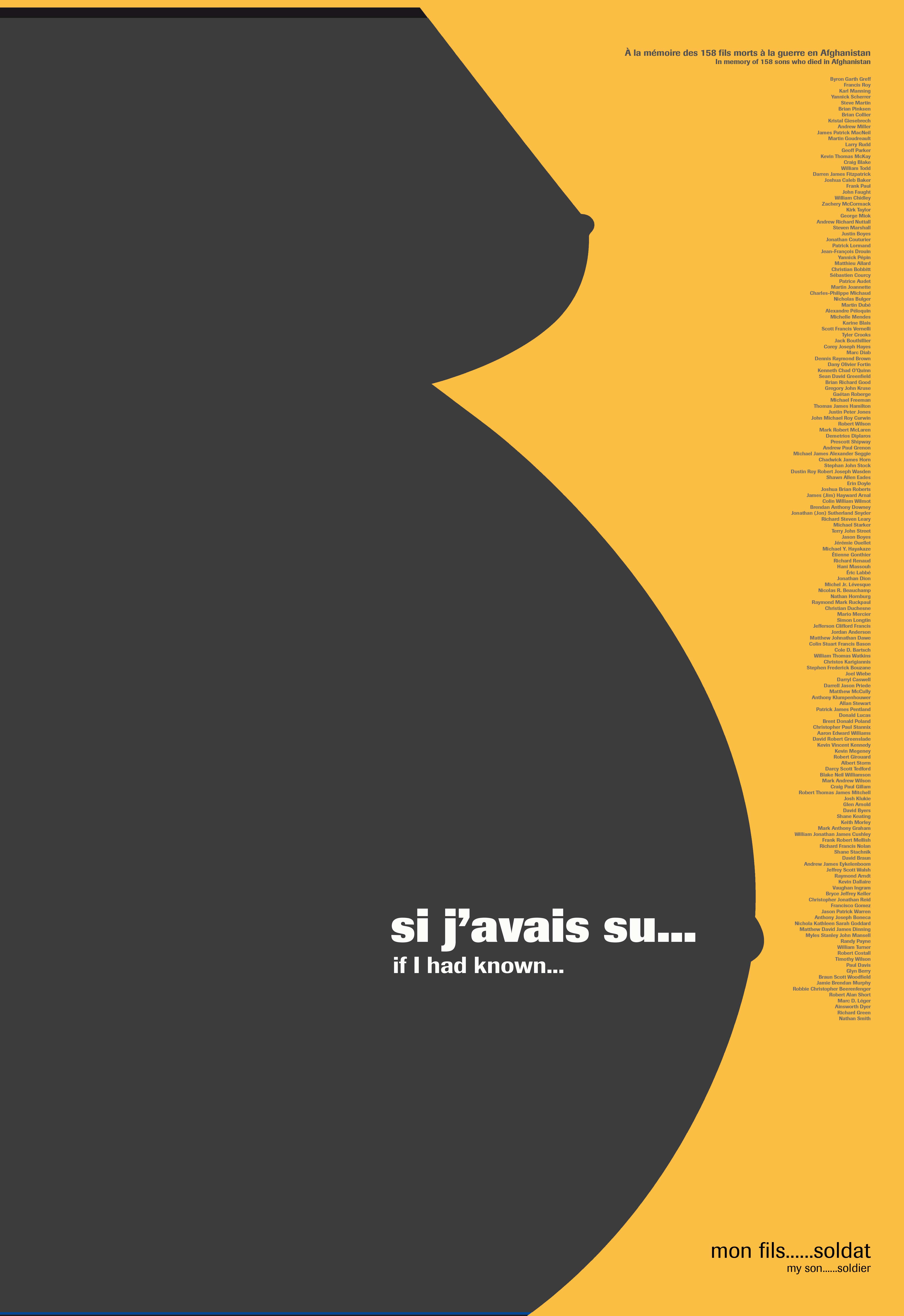 La liste des 158 soldats morts en Afghanistan est reproduite à la gauche du torse.