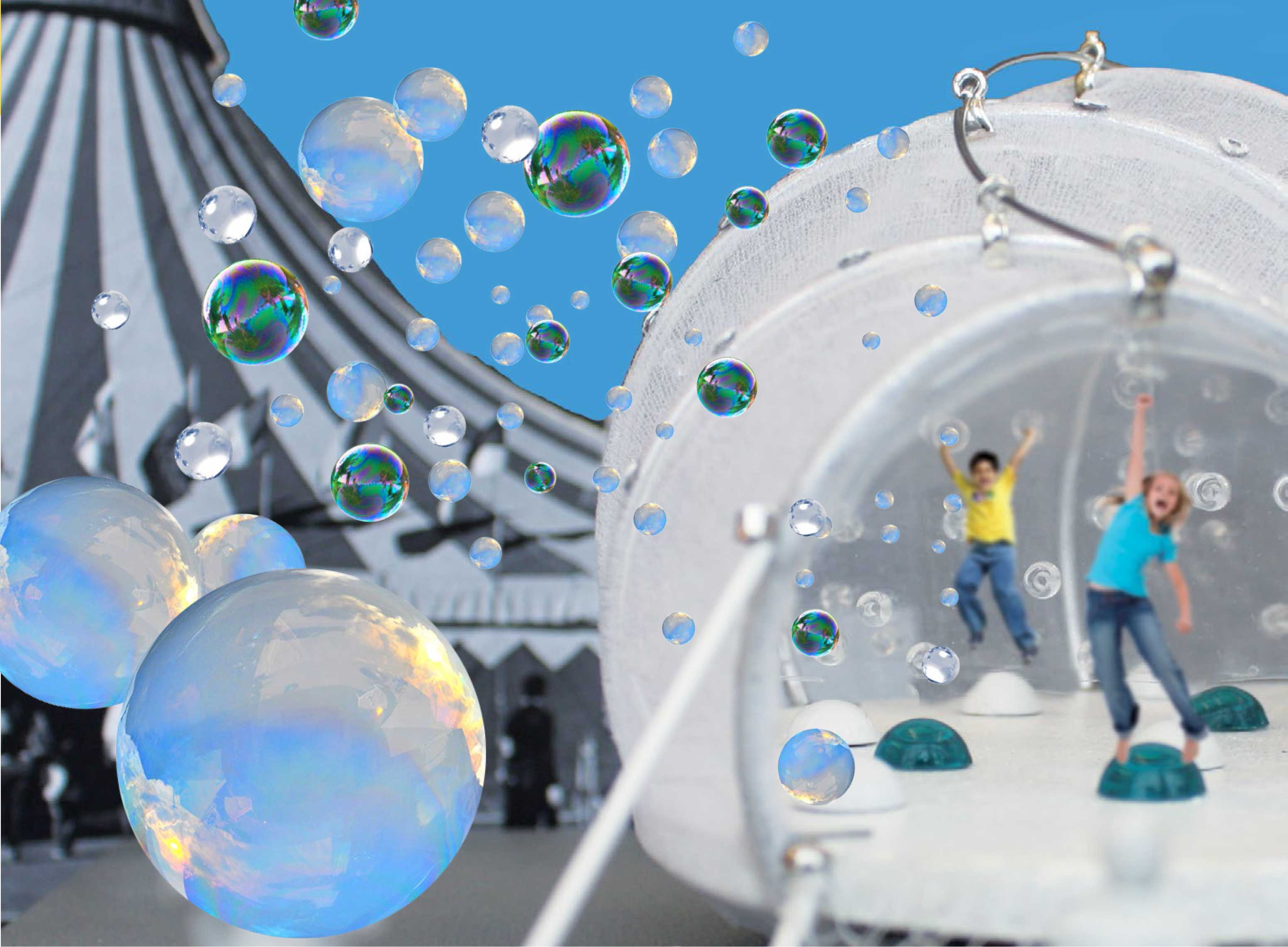 Qui, étant enfant, n’a pas fait des bulles de savons et s’est amusé simplement à les poursuivre? Notre concept exploite ce bonheur d’occasion et le magnifie. Mandibulle est une plate-forme par laquelle on accède en grimpant sur des filets situés aux deux extrémités de la tente. Ce type d’accès fort participatif rappelle les modules pour enfants situés dans les parcs et identifie déjà le public cible que l’on cherche à atteindre. Une fois à l’intérieur, les enfants seront attirés par les bulbes de caoutchouc chatoyants au sol. En sautant à pieds joints dessus, ils provoquent une changement de pression à l’intérieur du bulbe qui, ainsi comprimé, propulse l’air à l’intérieur d’une pompe. Cette pompe se prolonge par des tuyaux contenus dans les arceaux de la structure et aboutit dans un canon éjectant des bulles de savon à la fois à l’intérieur et à l’extérieur de la structure. Les enfants comprennent vite que plus on saute, plus il y a de bulles. Effectivement, à l’intérieur de la tente, les enfants disparaissent presque derrière les bulles. Avec le vent, ces fragiles bulles se dispersent et envahissent le site entier, une invasion mignonne qui plonge tous les spectateurs dans une ambiance éthérée et onirique.