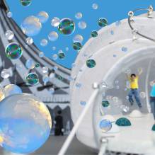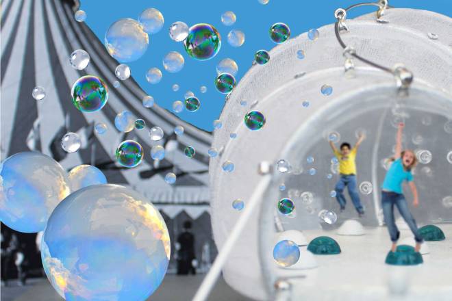 Qui, étant enfant, n’a pas fait des bulles de savons et s’est amusé simplement à les poursuivre? Notre concept exploite ce bonheur d’occasion et le magnifie. Mandibulle est une plate-forme par laquelle on accède en grimpant sur des filets situés aux deux extrémités de la tente. Ce type d’accès fort participatif rappelle les modules pour enfants situés dans les parcs et identifie déjà le public cible que l’on cherche à atteindre. Une fois à l’intérieur, les enfants seront attirés par les bulbes de caoutchouc chatoyants au sol. En sautant à pieds joints dessus, ils provoquent une changement de pression à l’intérieur du bulbe qui, ainsi comprimé, propulse l’air à l’intérieur d’une pompe. Cette pompe se prolonge par des tuyaux contenus dans les arceaux de la structure et aboutit dans un canon éjectant des bulles de savon à la fois à l’intérieur et à l’extérieur de la structure. Les enfants comprennent vite que plus on saute, plus il y a de bulles. Effectivement, à l’intérieur de la tente, les enfants disparaissent presque derrière les bulles. Avec le vent, ces fragiles bulles se dispersent et envahissent le site entier, une invasion mignonne qui plonge tous les spectateurs dans une ambiance éthérée et onirique.
