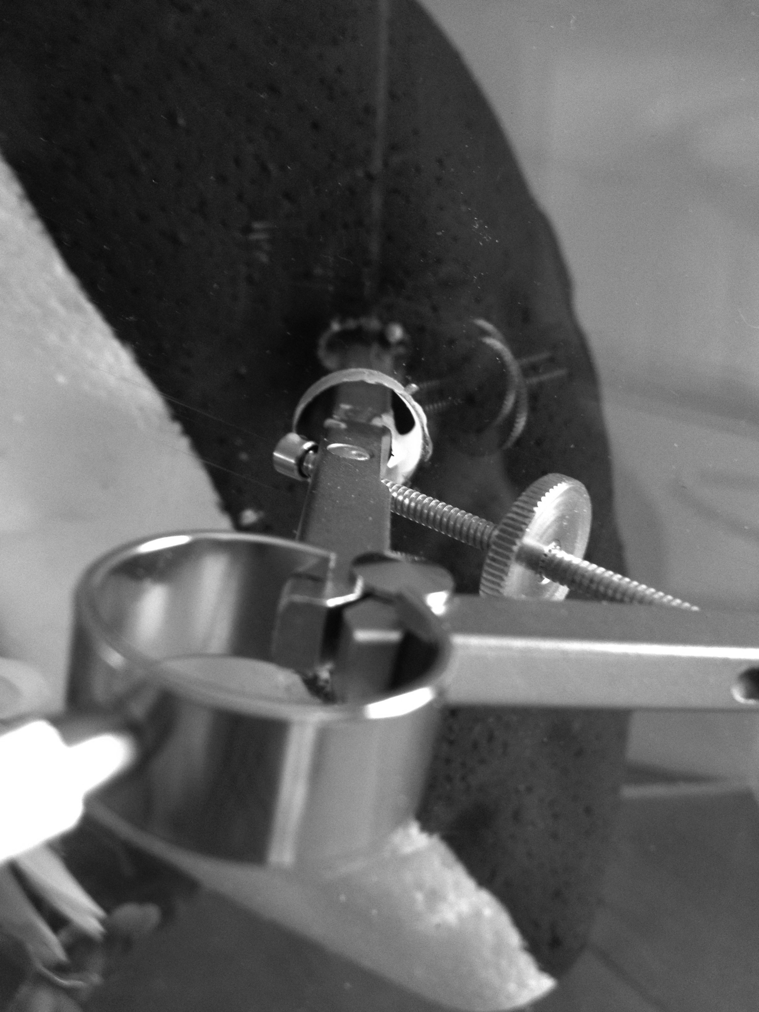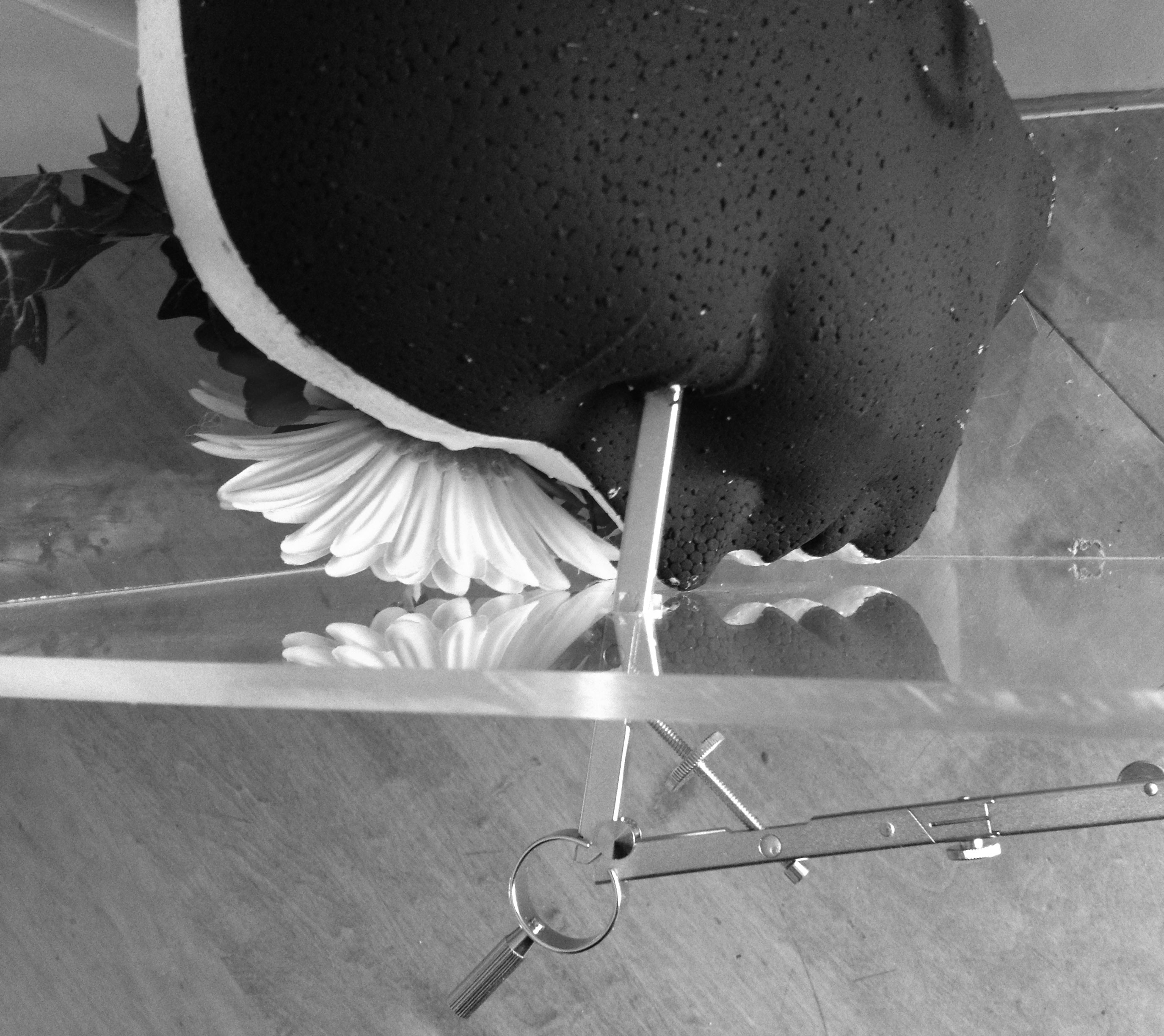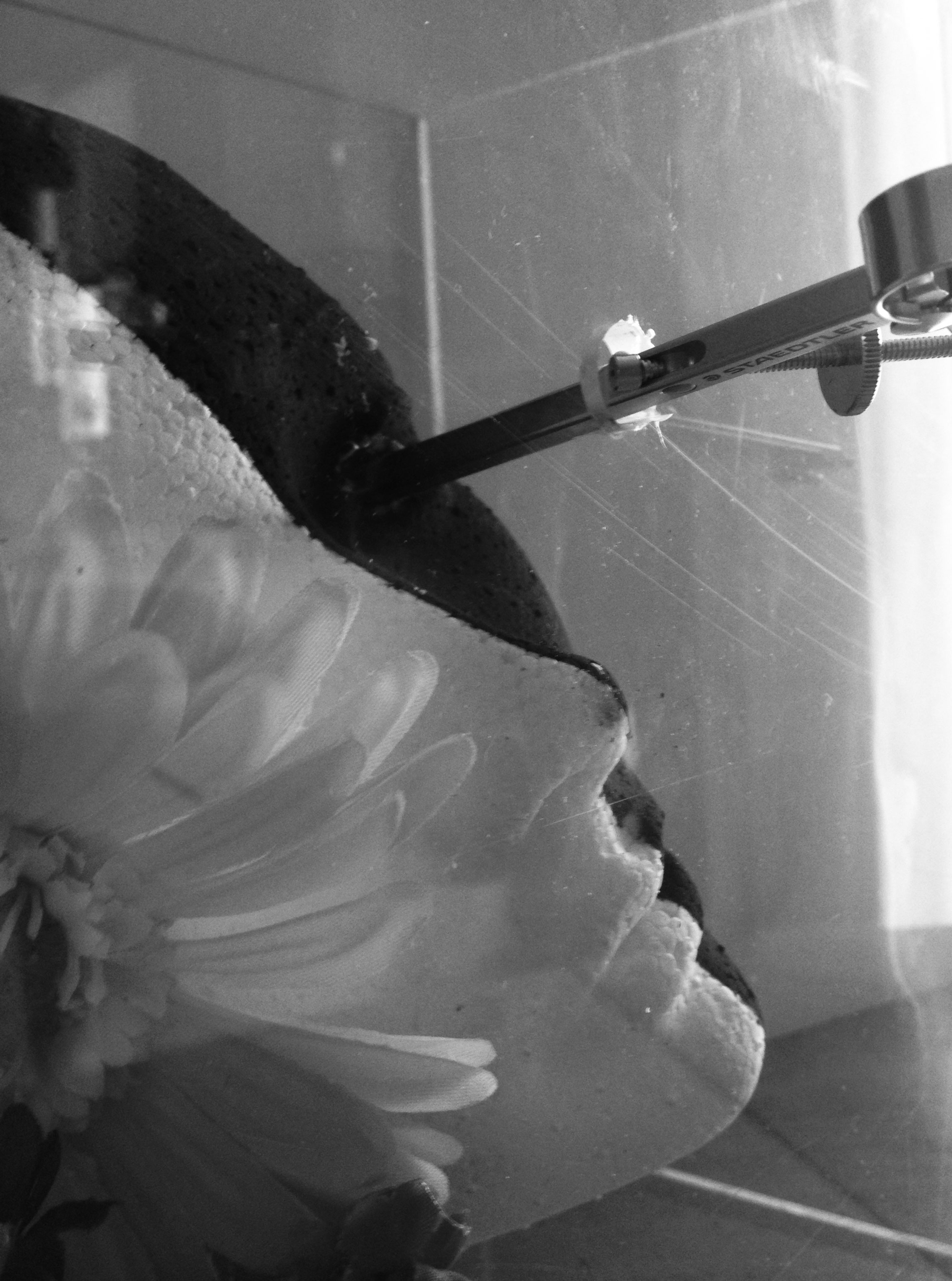 Il y a une signification pour laquelle j’ai décidé de placer cette tête dans une boîte. Elle sert ici à l’englober de façon rationnelle et mathématique. Ce côté cartésien en moi qui me tenaille. En faisant un trou pour passer au travers de la boite et du même coup atteindre l’œil, je brise ainsi ces deux côtés sombres. Et peut-être pour servir à les amoindrir ? En plaçant ce bâtonnet sous la boîte pour la déstabiliser, j’accentue le processus de « guérison ».